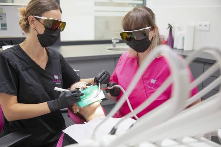 3. Dezinfekcia – zabíjanie baktérií je veľmi dôležitá schopnosť, ktorú nám laser umožňuje. Baktérie sú totiž v ústach zoskupené a organizované v tzv. biofilme – toto zoskupenie zvyšuje ich odolnosť na antimikrobiálne látky či ústne vody. Dezinfekčnú vlastnosť laseru vieme využiť pri mnohých stomatologických procedúrach: dezinfekcia koreňových kanálikov pri endodontickom ošetrení, hĺbkové čistenie parodontálnych vačkov pri zápaloch ďasien, dezinfekcia baktérií u hlbokých kazov, či dezinfekcia zapálených slizníc pri implantátoch.